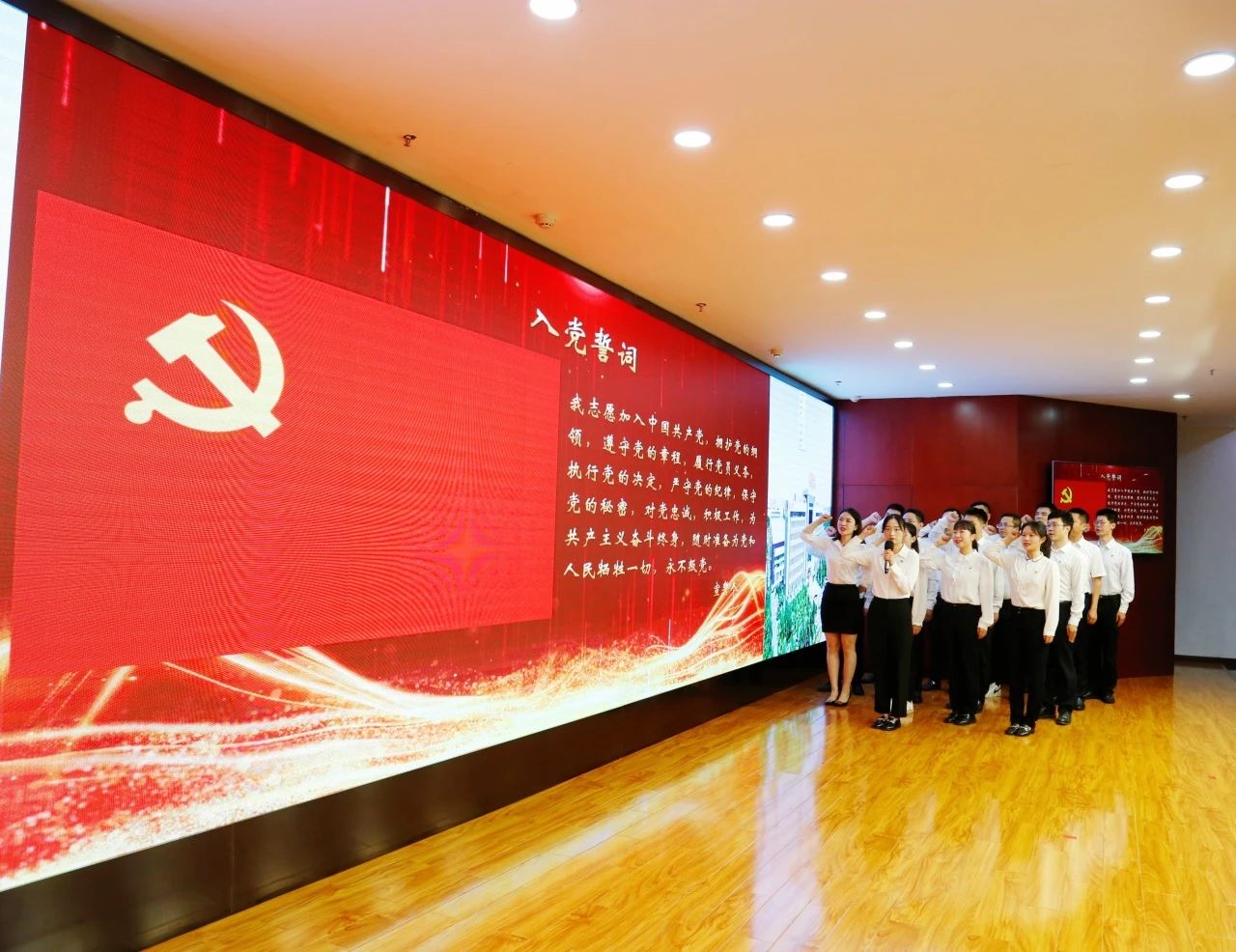 誓言铮铮,薪火相传,面对鲜红的党旗,预备党员整齐列队,高举右臂、紧握右拳,全场党员一同重温入党誓词,感悟中国共产党人的初心和使命,表达对党忠诚和为共产主义奋斗终身的决心。