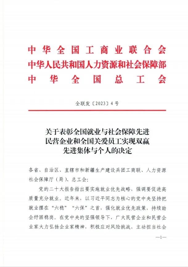 ▲《关于表彰全国就业与社会保障先进民营企业和全国关爱员工实现双赢先进集体与个人的决定》及附件(部分)