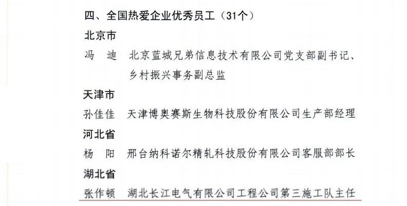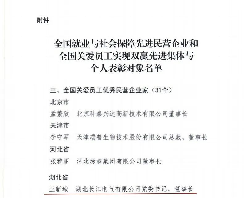 近日,中华全国工商业联合会、中华人民共和国人力资源和社会保障部、中华全国总工会发布《关于表彰全国就业与社会保障先进民营企业和全国关爱员工实现双赢先进集体与个人的决定》,长征娱乐电气党委书记、董事长王新城荣获湖北省唯一“全国关爱员工优秀民营企业家”称号,长征娱乐电气员工张作顿荣获湖北省唯一“全国热爱企业优秀员工”称号。