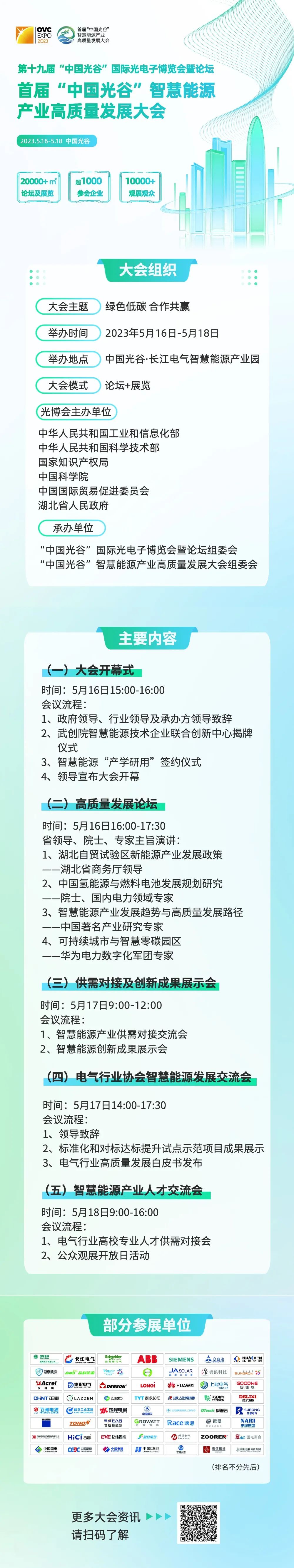 2023年5月16日至18日,首届“中国光谷”智慧能源产业高质量发展大会将在中国光谷举行。本次大会是第十九届光博会首次举办智慧能源领域分论坛,大会以“绿色低碳,合作共赢”为主题,旨在为政府、科研机构、行业及用能单位搭建“共建、共享、共治、共赢”发展平台,以数字化勾勒绿色发展蓝图,共同打造智慧能源产业生态圈,汇聚智慧能源产业发展磅礴力量。