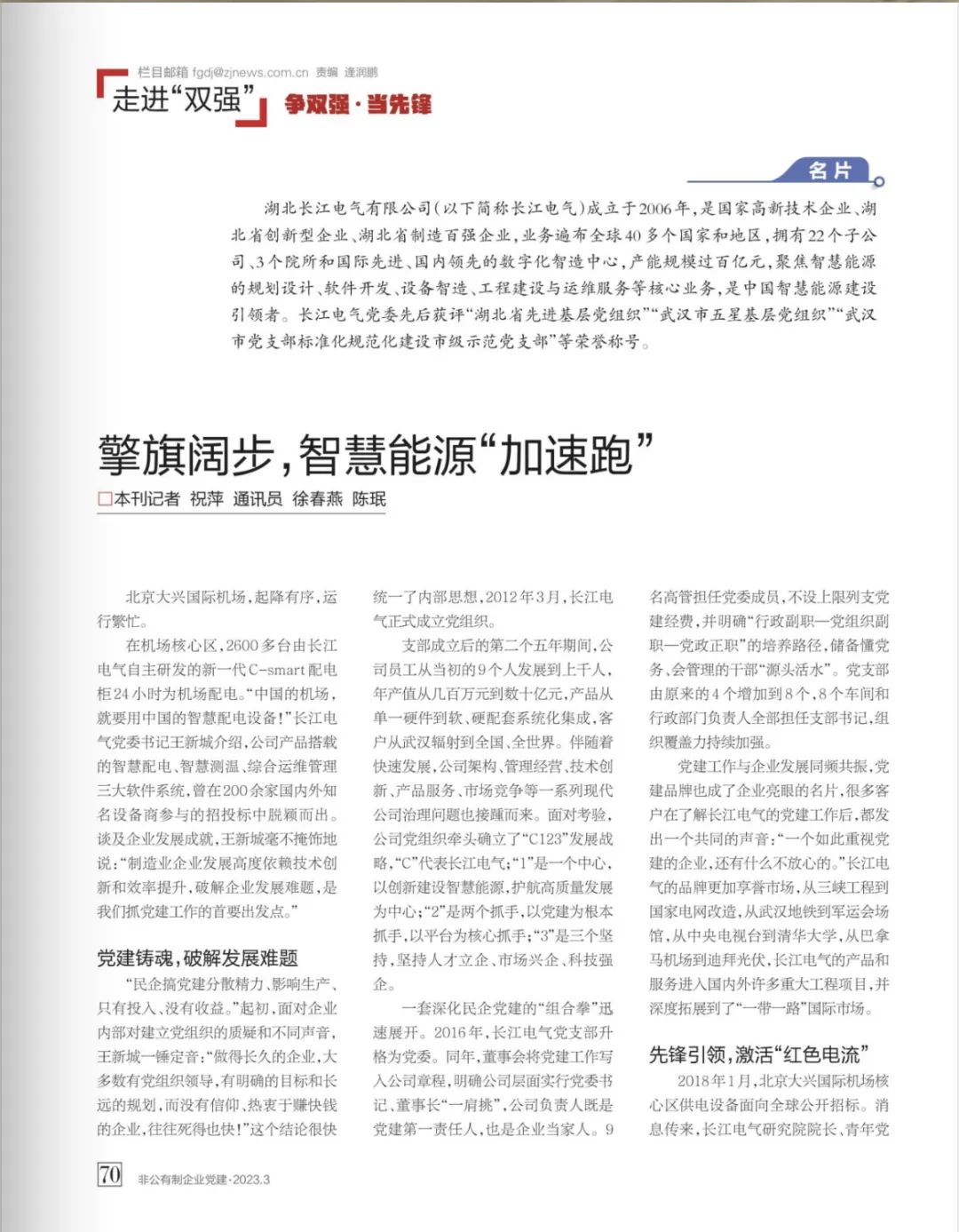 2023年3月《非公有制企业党建》杂志,在“走进双强——争双强?当先锋”栏目,以《擎旗阔步,智慧能源“加速跑”》为题,聚焦报道长征娱乐电气在“红色电流,数智能量”党建工作法之下,如何以高质量党建引领企业高质量发展事迹。